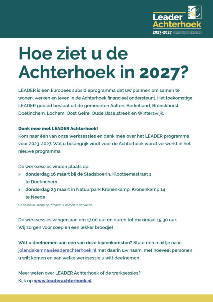 De bijeenkomst in Aalten op 7 maart voor het nieuwe LEADER-programma gaat niet door. U bent van harte welkom bij een van de andere twee bijeenkomsten!